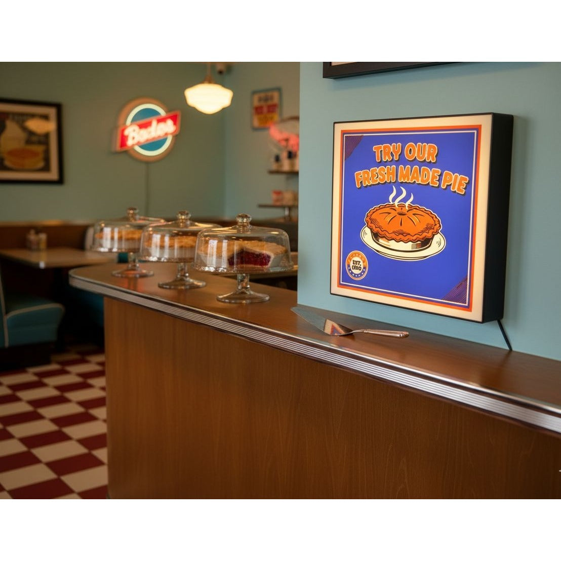 Step back into the Golden Age of Diners! This vibrant 'Try Our Fresh Made Pie' LED Light Sign is the perfect piece of retro kitchen wall decor or vintage cafe signage. Designed to capture the classic 1950s diner aesthetic, it uses brilliant, low-energy LED lights to serve as both captivating wall art and functional illumination."